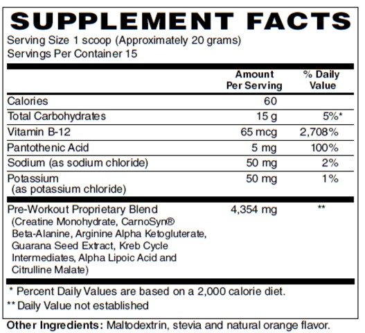 Provides~4g creatine plus ~100mg naturally occurring caffeine from guarana and lots of B vitamins in a refreshing citrus flavor. Does not contain hormones, steroids, artificial stimulants, preservatives, or artificial flavors/ sweeteners. Fast acting and easy to use.