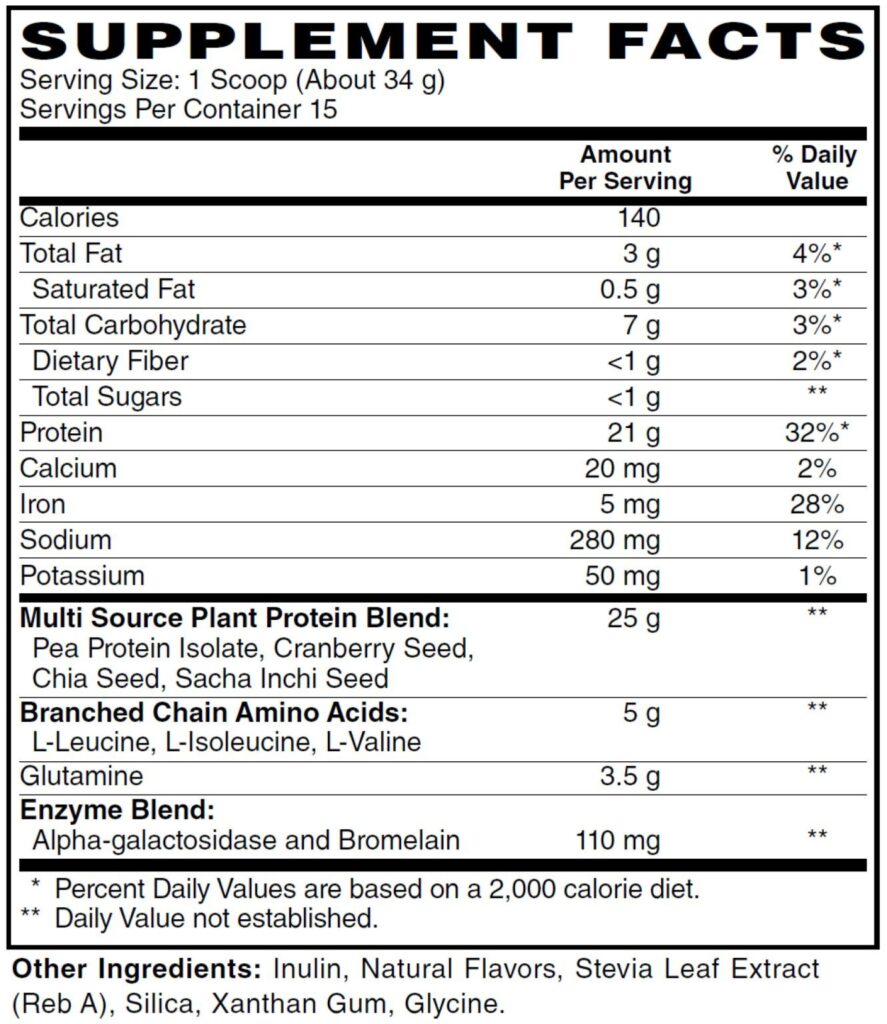 Low Glycemic Non GMO Vegan Powder. Gluten Free!‡ Each scoop provides 21g protein – from peas, cranberry seeds, chia seeds, and Sacha Inchi seeds – it also contains 4.5g of BCAAs, and 3.5g L-Glutamine.